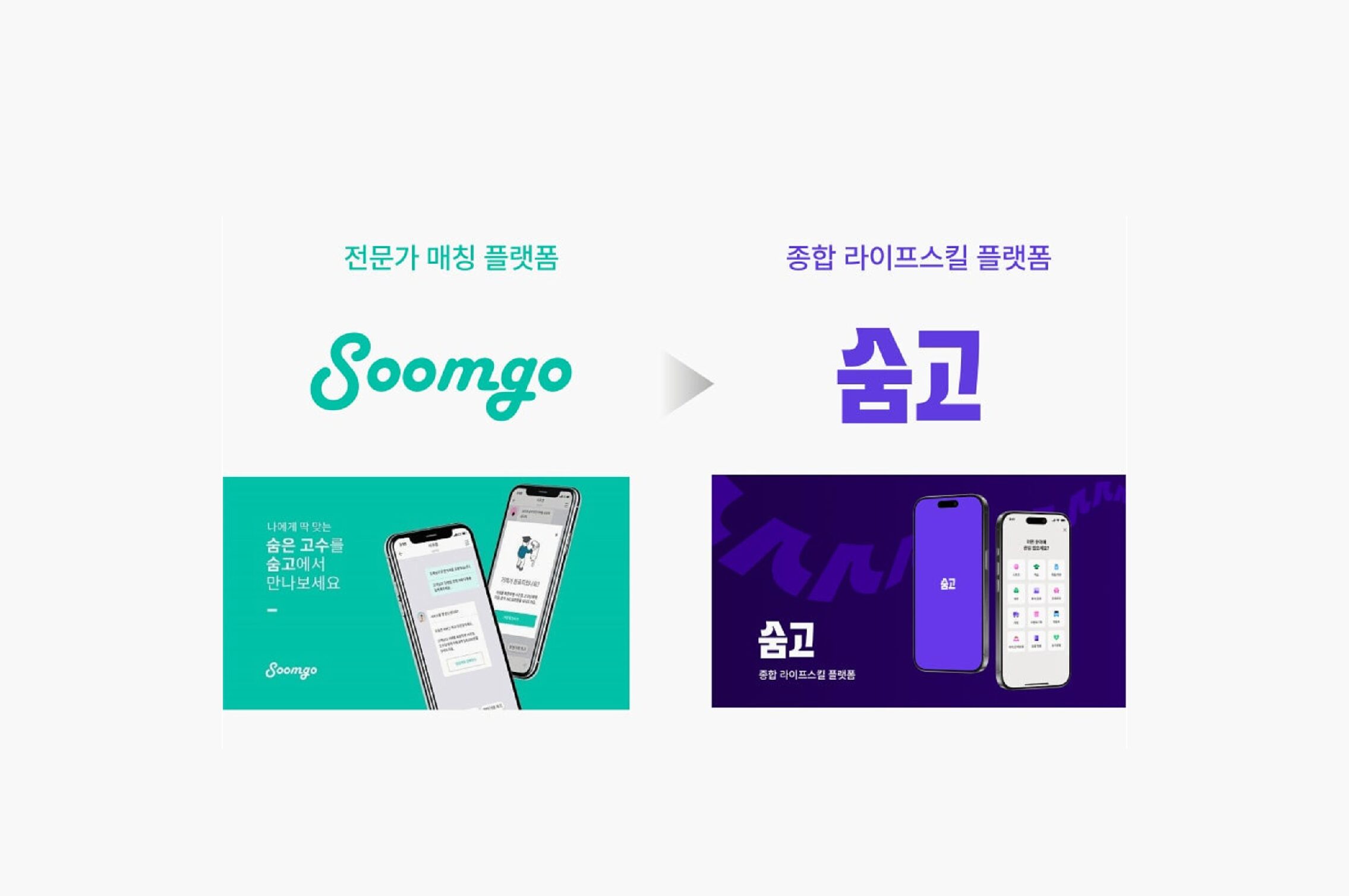 ‘일상의 진보를 위한 기술’로 이전보다 좀 더 폭넓은 미션으로 명확한 재설정이 이뤄지니 이러한 명확한 시각적 아이덴티티도 도출되었을 것입니다. 이번 변화의 가장 큰 포인트는 숨고의 정체성 변화였습니다. ‘전문가 매칭 플랫폼’에서 ‘종합 라이프스킬 플랫폼’으로 더 넓고 진취적인 면모를 강조하고 있습니다.