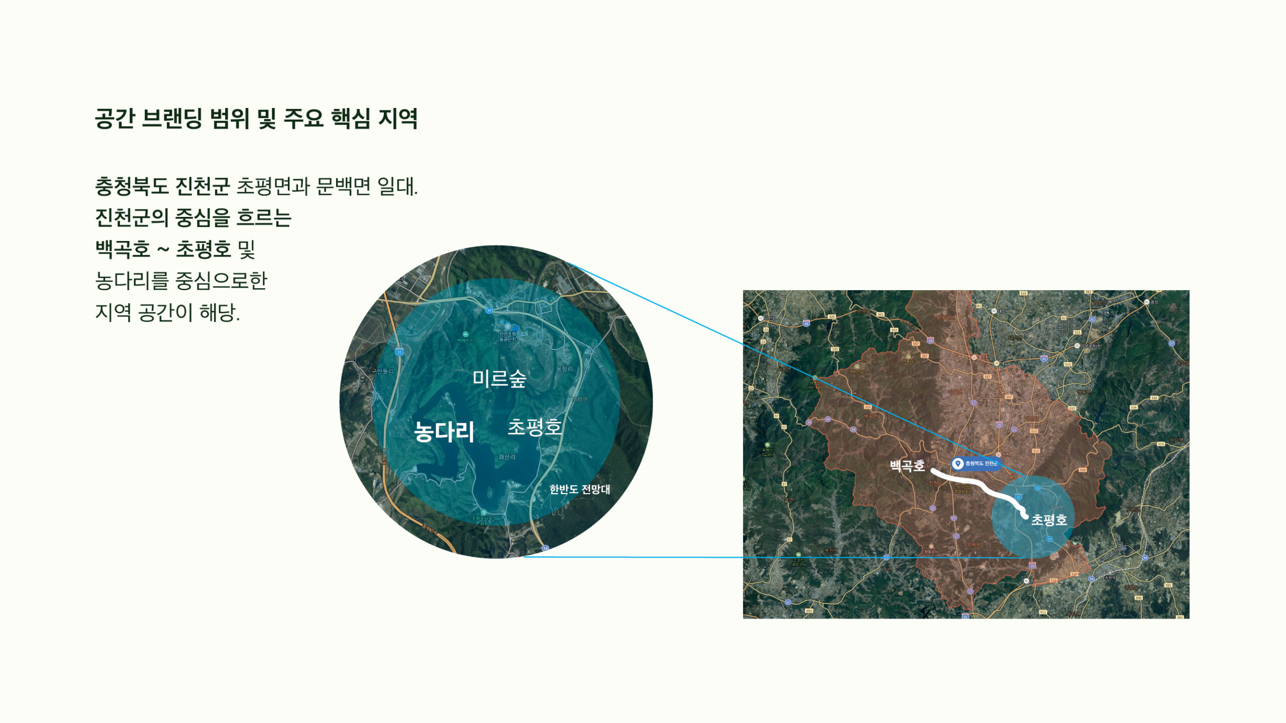 충청북도 서북부에 위치한 진천군은 비옥한 농토와 아름다운 자연환경으로 유명합니다. 예로부터 ‘생거진천(生居鎭川); 살아 생전에 가장 살기 좋은 곳’이라는 말이 있을 만큼 정주 환경이 매우 뛰어나다는 인식이 있었습니다. 이번 사업 공간의 범위는 진천 안에서도 초평면과 문백면 일대입니다. 이 지역은 진천군의 중심을 흐르는 백곡천과 초평호가 포함되어 있습니다. 이곳은 진천 읍내 주거 공간과 농토와 호수로 이루어진 자연과 도심이 조화로운 공간입니다.
